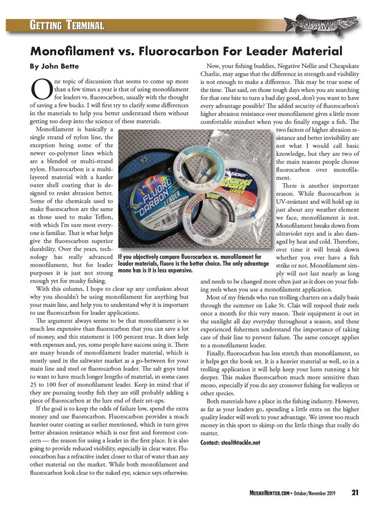 MHM Oct/Nov 2019 (Page 21) One topic of discussion that seems to come up more than a few times a year, is the topic of using monofilament for your leaders vs. fluorocarbon to help you save a few bucks. Before we really get into discussing things, I will try to clarify some differences…